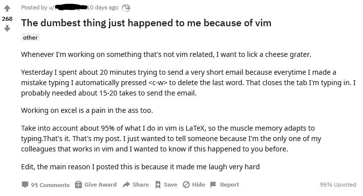 The comments are split between vim users telling the OP to just write the email in vim and then paste it into the browser, and emacs users telling them to write the email in emacs and use emac’s built-in emailing system to send it. There’s also a comment by a bot that posted the numbers for the National Suicide Prevention Lifeline because it thought the OP actually wanted to lick a cheese grater. Normal tech stuff.
